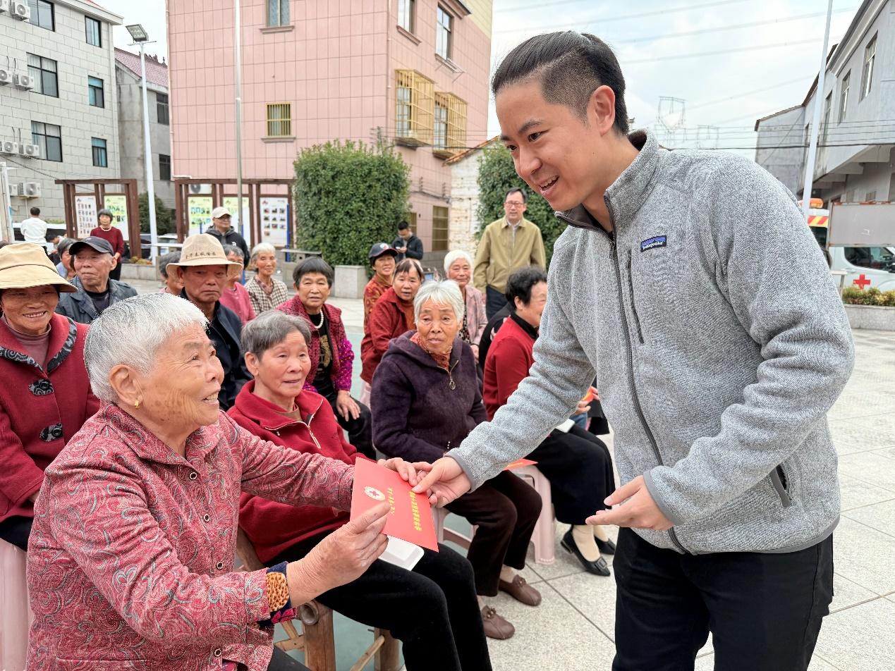 村里的文化舞臺(tái)下,紅底黃字的“重陽(yáng)慰問(wèn)”橫幅早早就掛了起來(lái);辦公樓前,一袋袋米油面碼得整整齊齊;志愿者們忙忙碌碌穿梭其間,熟絡(luò)地給老人們剪指甲、梳頭發(fā)、嘮家常——10月27日上午,金東區(qū)嶺下鎮(zhèn)摩訶村文化廣場(chǎng)上,洋溢著濃濃的節(jié)日氛圍。在2025年重陽(yáng)節(jié)來(lái)臨之際,金廈集團(tuán)總裁傅融率集團(tuán)高層再次走進(jìn)摩訶村,帶著心意,赴這場(chǎng)持續(xù)了14年的“敬老之約”。